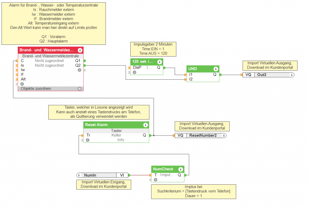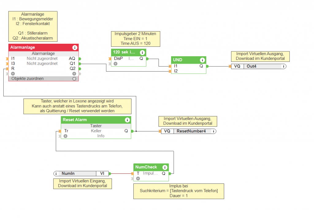 Beim vorinstallierten Baustein Alarmanlage von Loxone, möchten wir den Ausgang Q1 ( Name ) als Anlass für einen Anruf verwenden.