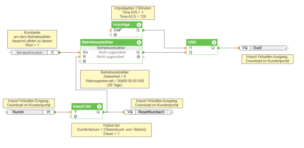 Um Wartungsintervalle mit Erinnerungsanrufe zu realisieren, kann man den Standard Baustein Betriebszeitzähler verwenden.